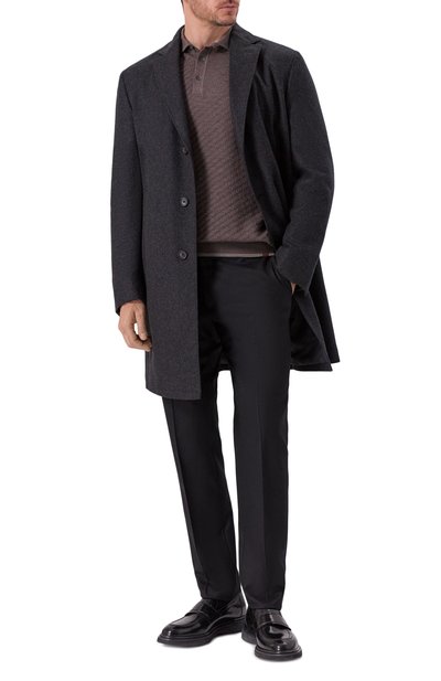 Поло с фактурным узором выполнили из шерстяного трикотажа. Модель с контрастным кантом по краю отложного воротника, манжет и пояса украсили фирменной нашивкой Shark tag снизу.