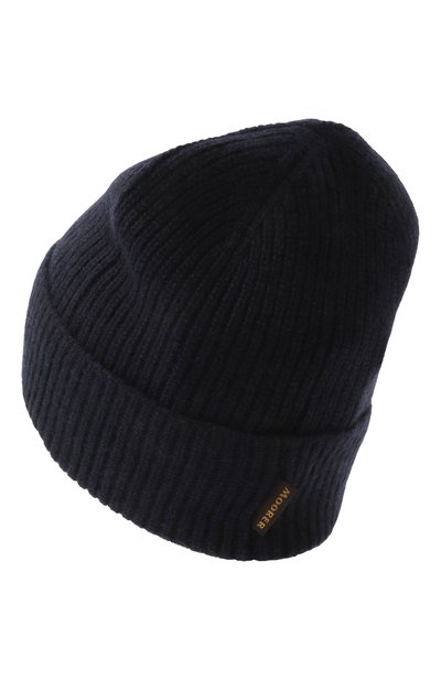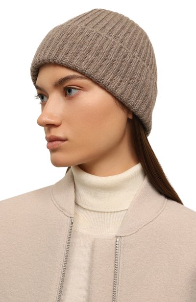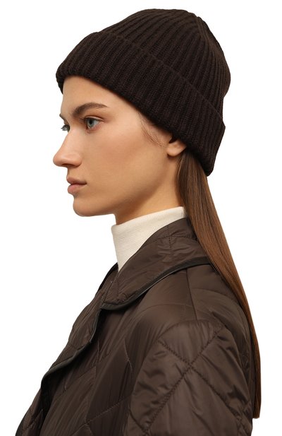 Шапку бини в рубчик связали из легкой кашемировой пряжи. Широкий отворот эластичного аксессуара украсили небольшим патчем с логотипом бренда.