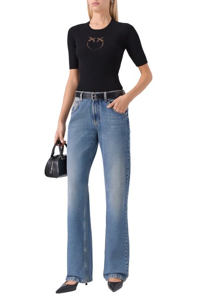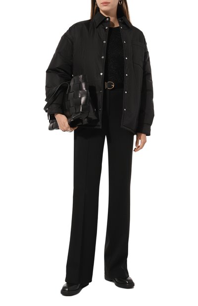 Пуловер с короткими рукавами выполнили из шерсти с добавлением вискозы и нитей ламе. Связанную гладью модель дополнили широким поясом, манжетами и круглой горловиной в рубчик.