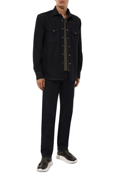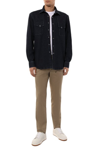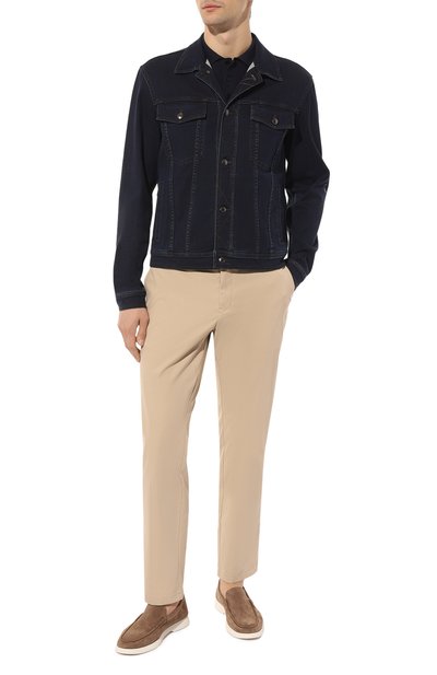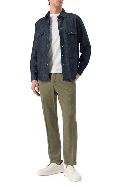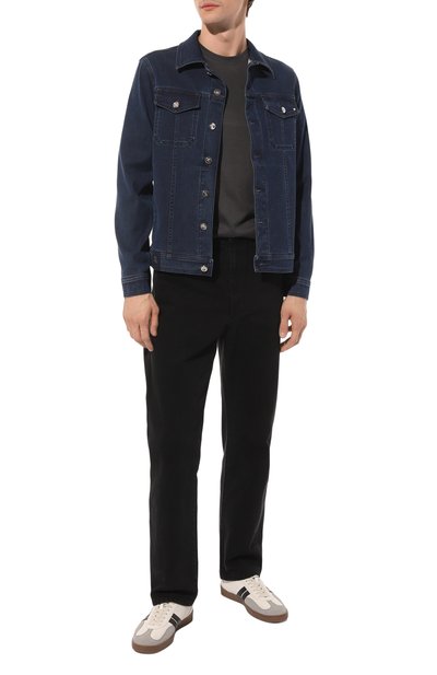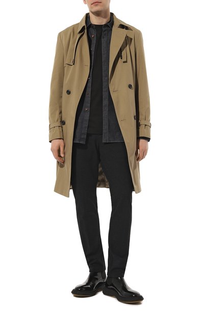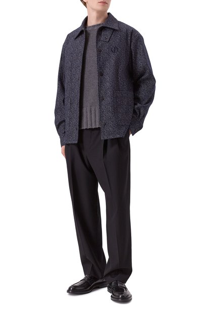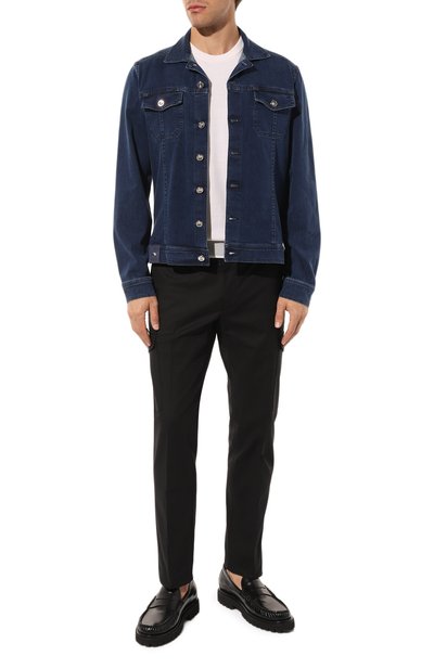 Куртку на пуговицах выполнили из денима стрейч с добавлением кашемира и шелка. Модель с регулируемыми патами на поясе дополнили боковыми карманами и накладными нагрудными с клапанами.