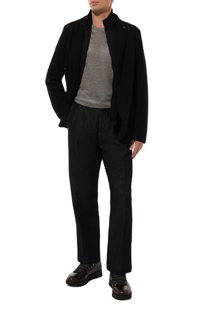 Меланжевая футболка с круглым вырезом сшита из шерстяного джерси с легким атласным блеском. Эластичная модель прямого кроя удачно допо лнит базовый гардероб.