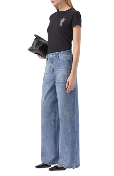 Расклешенные джинсы с высокой посадкой сшили из денима на основе органического хлопка. Модель с декоративными заломами дополнили пятью карманами, а пояс подчеркнули брендированным патчем из телячьей кожи.