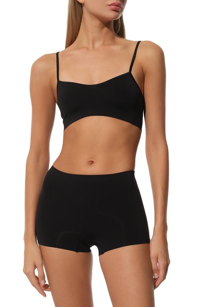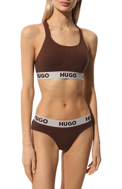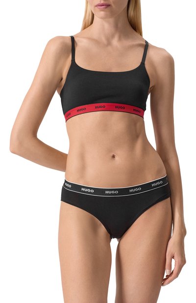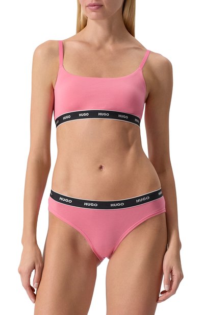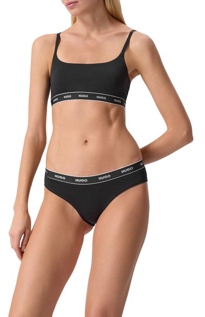 Бюстгальтер с брендированным поясом и регулируемыми бретелями сшит из эластичного хлопкового трикотажа. В комплект входят два изделия разных цветов.