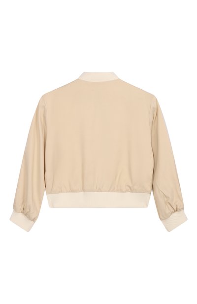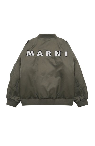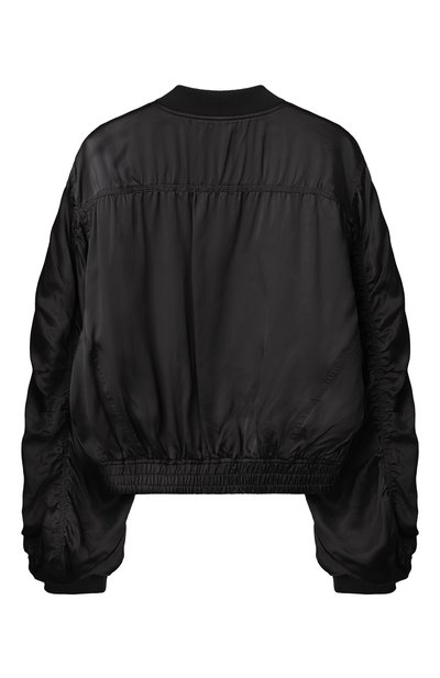 Бомбер с тремя карманами, включая нарукавный, выполнили из нейлонового атласа. Утепленную куртку с поясом, воротом и манжетами из трикотажа в рубчик украсили на спинке фирменной белой строчкой.