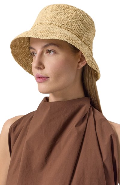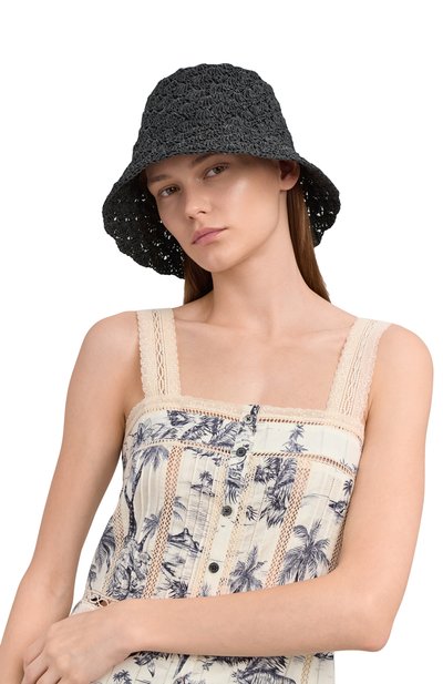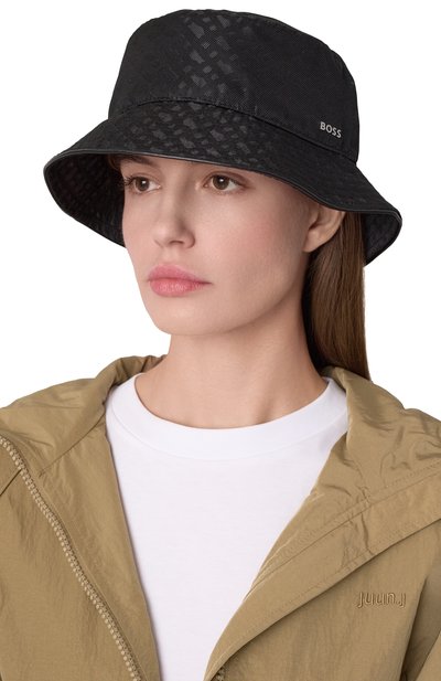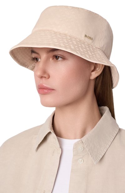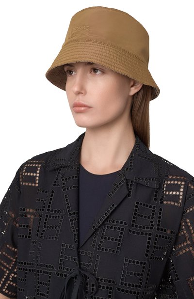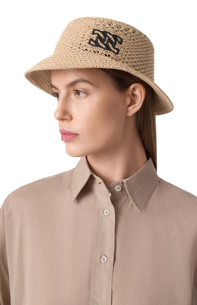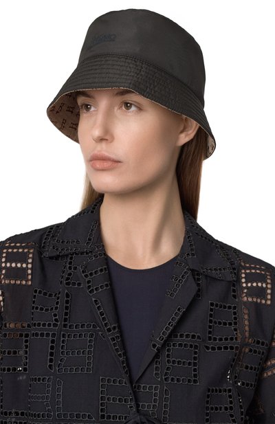 Панама с широкими полями выполнена из ворсистой полушерстяной ткани с леопардовым принтом. Аксессуар украшен вышитыми логотипами марки спереди.