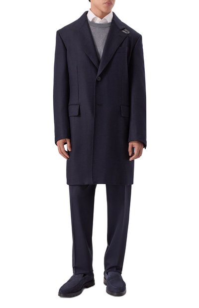 Пальто с нагрудным и двумя боковыми карманами изготовили из ворсистого кашемира, а подкладку выполнили из вискозы. Модель на пуговицах дополнили шлицей сзади.