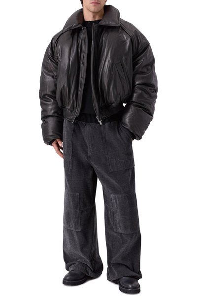 Бомбер на встречной молнии сшили из стираной кожи ягненка. Для манжет, пояса и воротника выбрали шерстяной трикотаж, а для стеганого подклада – купро. Помимо увеличенных карманов по бокам предусмотрели еще один небольшой на левом рукаве, украсив его патчем с эмблемой Equestrian Knight Design.