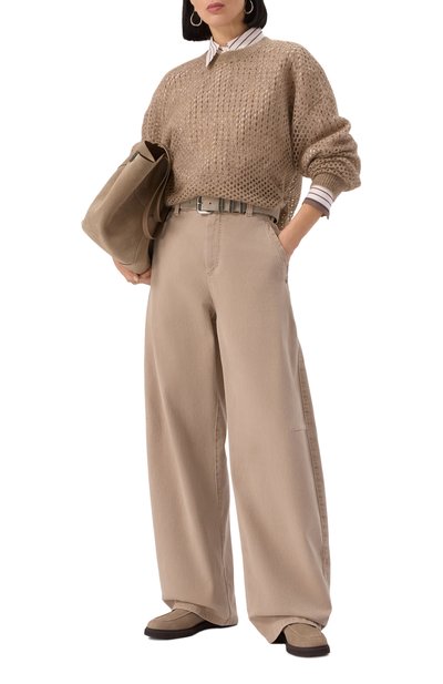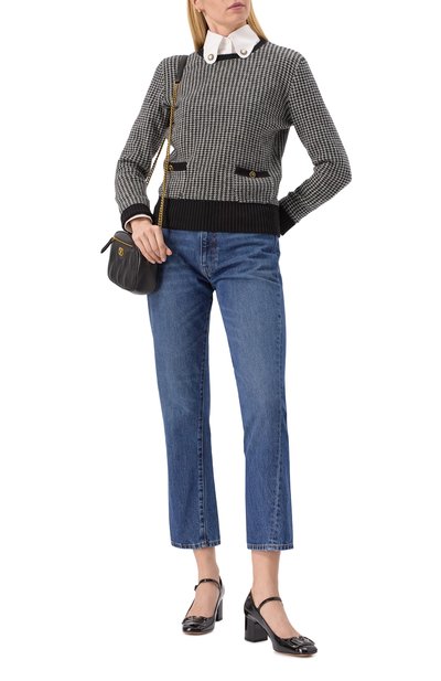 Пуловер в фирменную клетку Burberry Check связали из шерстяной пряжи с добавлением полиэстера. Однотонные манжеты, пояс и круглую горловину выполнили в рубчик.