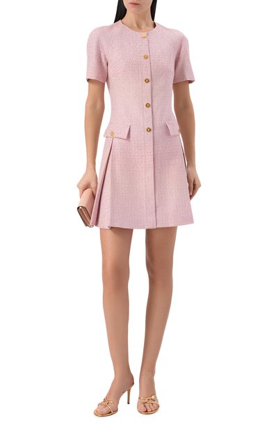 Приталенное платье сшили из крепа Couture на основе шерсти первого пострига и шелка, подчеркнув воротник-стойку и рукава контрастным макраме. Планку с потайными кнопками украсили золотистыми пуговицами с кристаллами, заменив верхнюю металлическим сердцем.