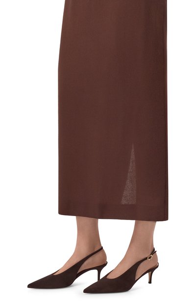 Слингбэки Bazel с зауженным мысом выполнили из замши тонкой выделки. Этим же материалом обтянута шпилька средней высоты. Регулируемый ремешок на пятке застегивается фирменной пряжкой Ribbon.