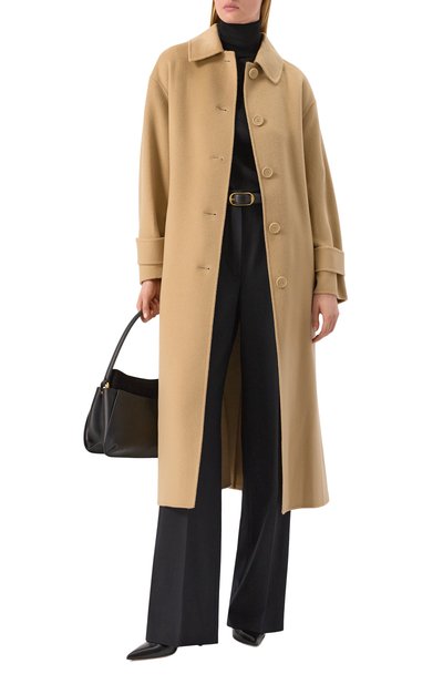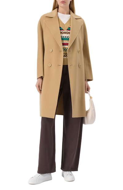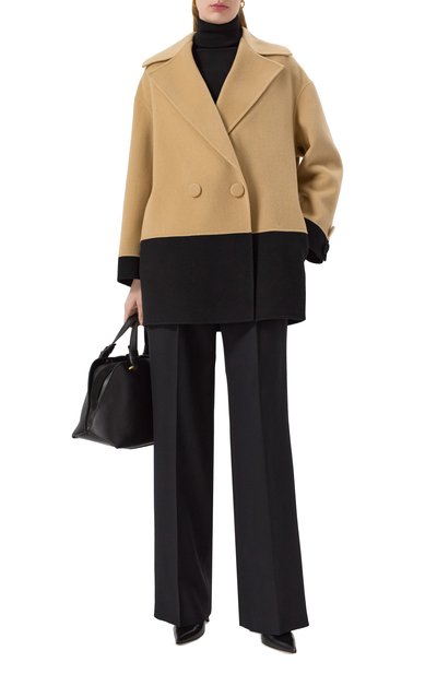 Двубортное пальто с широкими лацканами дополнили парой боковых карманов. Для изготовления прямой модели с атласным подкладом использовали плотную шерсть.