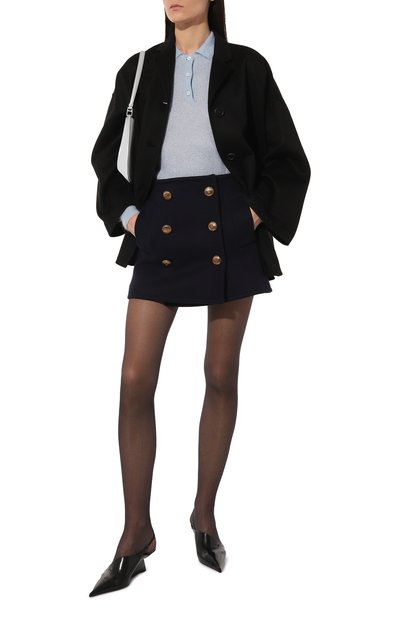 Поло в рубчик выполнили из шерстяного трикотажа. Модель, застегивающуюся пятью перламутровыми пуговицами, дополнили кружевным воротником с оборкой по краю.