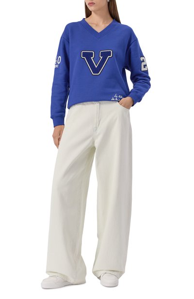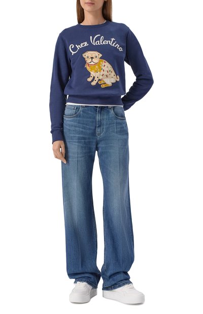 Свитшот из хлопкового трикотажа с петельчатой изнанкой украсили состаренным принтом Panther Lady. Декор поддержали эмблемой Chez Valentino на спинке, а рукава реглан подчеркнули швами с необработанным краем.