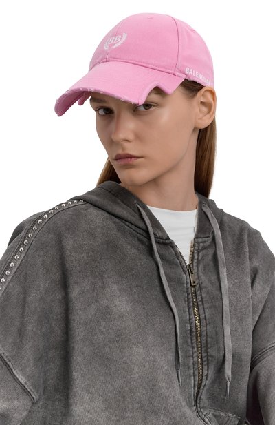 Бейсболку Blackletter Script с потертостями выполнили из хлопкового твила. Фигурный козырек и заднюю сторону аксессуара с регулируемым ремешком велкро украсили готическим логотипом, вышитым контрастной нитью.