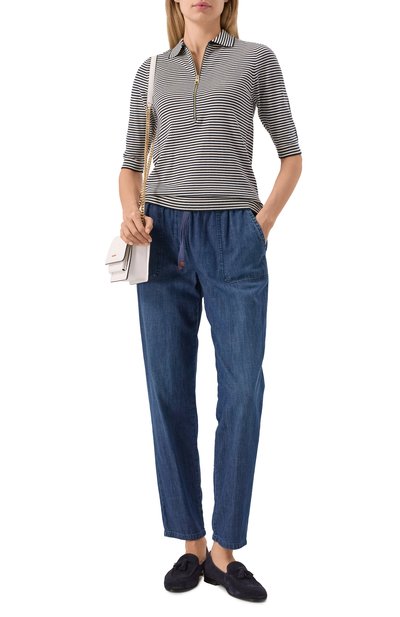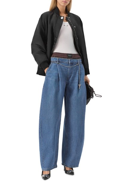 Джинсы с пятью карманами сшиты из хлопкового денима. Модель дополнена вставкой, имитирующей нижнее белье с брендированной резинкой. Пояс с необработанным краем украшен фирменным патчем сзади.