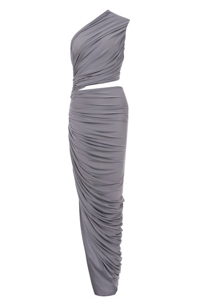 Драпированное по всей длине платье на одно плечо выполнили из вискозного джерси оттенка Gris. Треугольный вырез сбоку акцентирует внимание на талии, а разрез оголяет правую ногу.