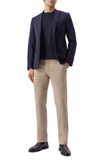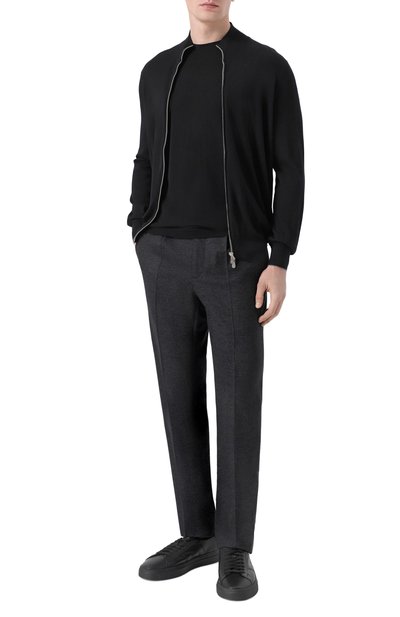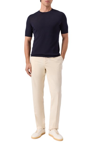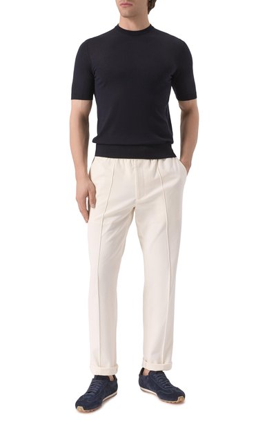Джемпер выполнили из тонкого трикотажа на основе мериносовой шерсти с волокнами толщиной 13,5 микрон. Модель с круглой горловиной дополнили эластичными манжетами и поясом.