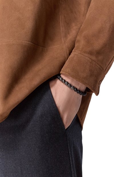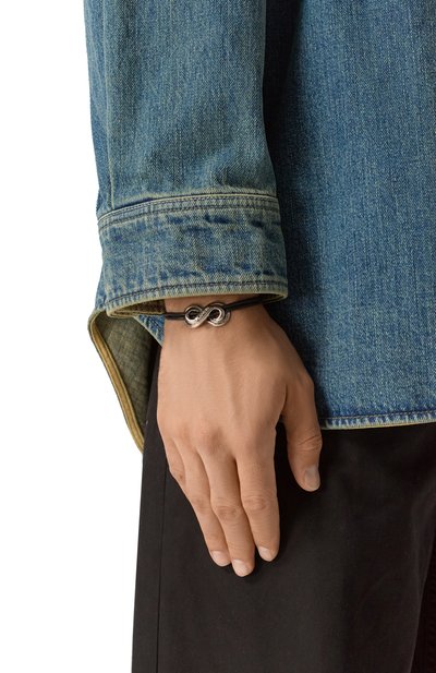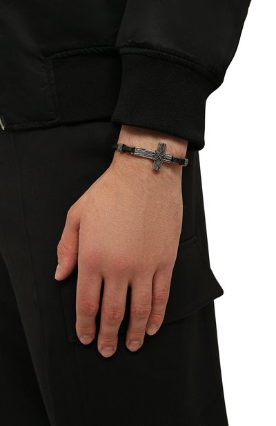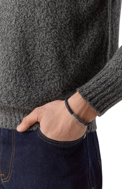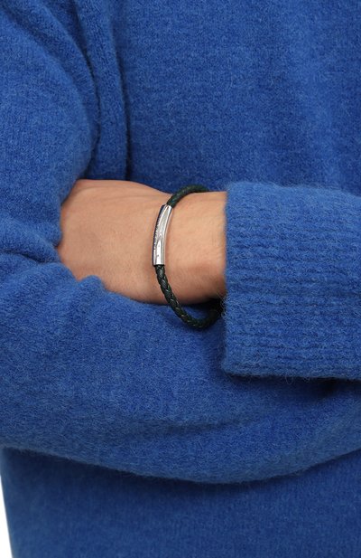 Тонкий браслет сплели из зернистой итальянской кожи. А ксессуар дополнили брендированным замком-защелкой из оксидированной стали, декорированным рельефным шевронным узором.