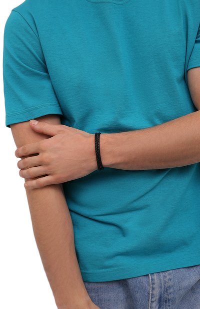 Тонкий браслет сплели из зернистой итальянской кожи. Аксессуар дополнили брендированным замком-защелкой из оксидированной стали, декорированным рельефным шевронным узором.
