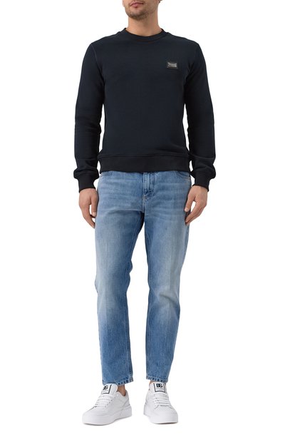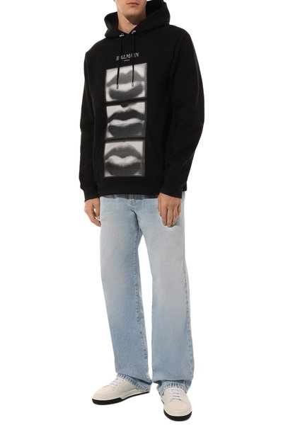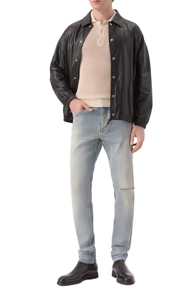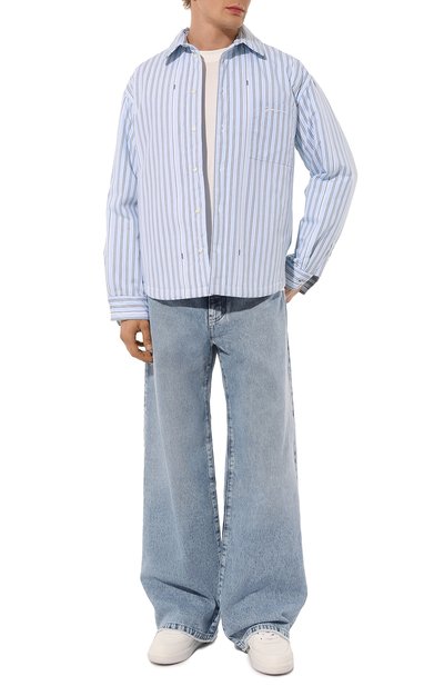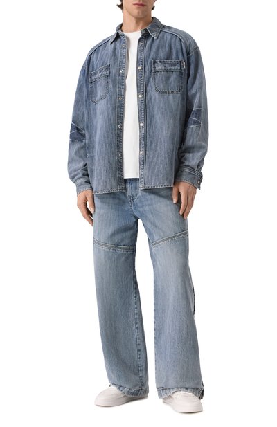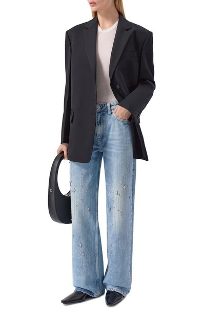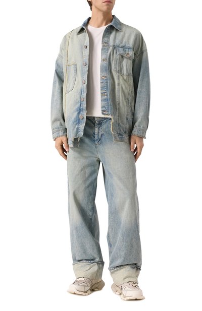 Широкие джинсы со складками спереди выполнили из неэластичного денима. Выбеленную модель с пятью карманами декорировали сзади небольшой этикеткой с логотипом марки.