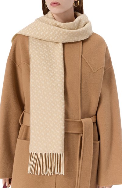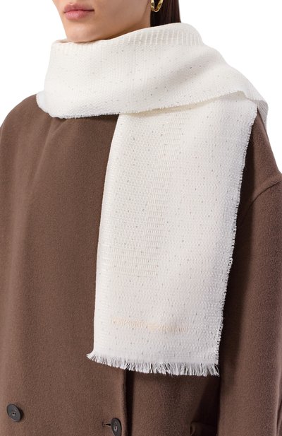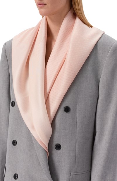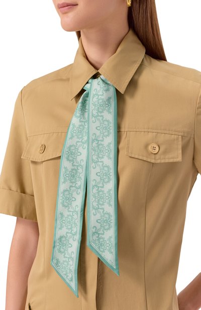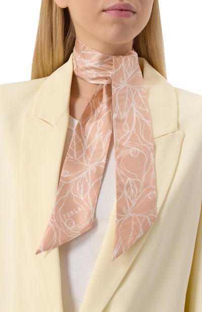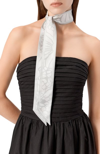 Узкий шарф-твилли со скошенными краями выполнили из шелкового твила. Одну сторону аксессуара с полосатым кантом декорировали цветочным узором, а вторую – геометрическим орнаментом.