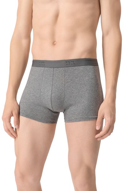 Боксеры с плоскими швами выполнили из меланжевого хлопкового трикотажа. Широкий эластичный пояс в рубчик украсили жаккардовым логотипом в тон спереди.