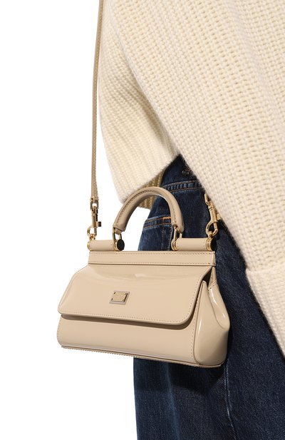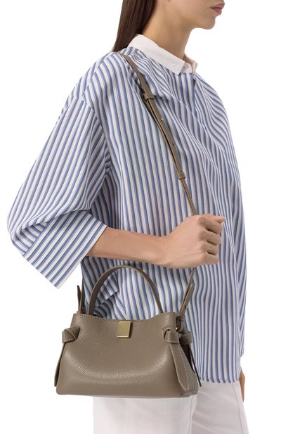 Сумку со съемным плечевым ремнем выполнили из крупнозернистой кожи. Модель с поворотным замком украсили спереди четырьмя отстегивающимися лентами, которые крепятся при помощи кнопок.