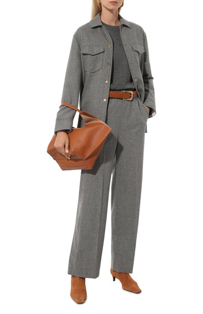 Брюки Resca с защипами и стрелками дополнили отворотами на брючинах и четырьмя карманами. Модель из шерстяной ткани с шевронным узором украсили фирменной деталью на шлевке спереди и звездой сзади.