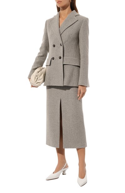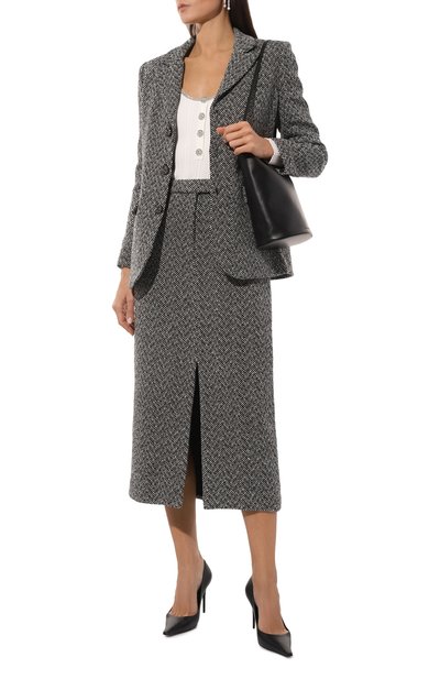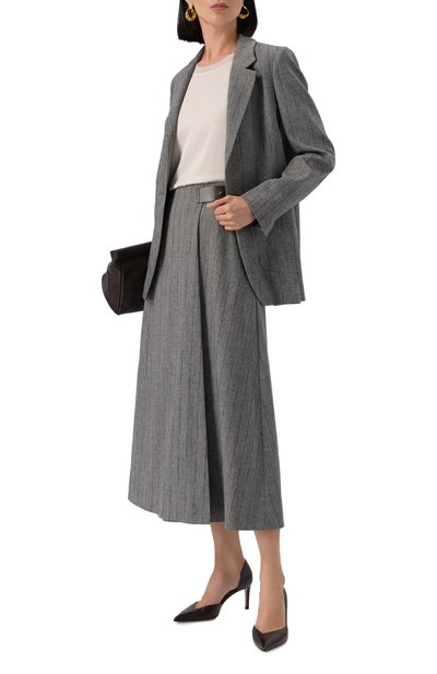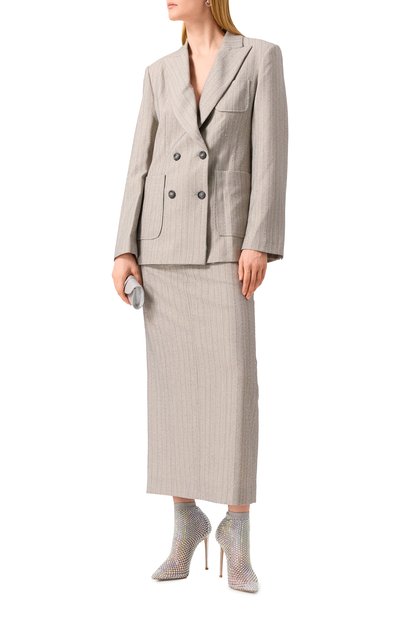 Шорты в тонкую мерцающую полоску выполнили из костюмной ткани с добавлением шерсти. Модель с боковыми и задними карманами декорировали сзади фирменной звездой.