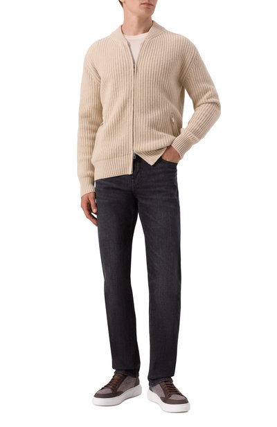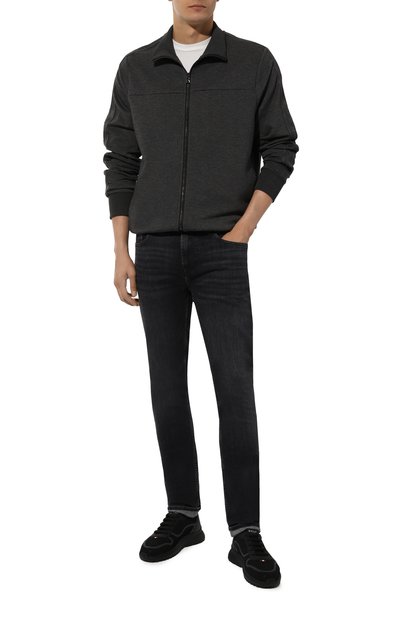 Выбеленные джинсы с потертостями и небольшими разрывами украсили брендированной нашивкой сзади и фирменной пластиной под поясом спереди. Модель с пятью карманами изготовили из микса хлопка и эластана.