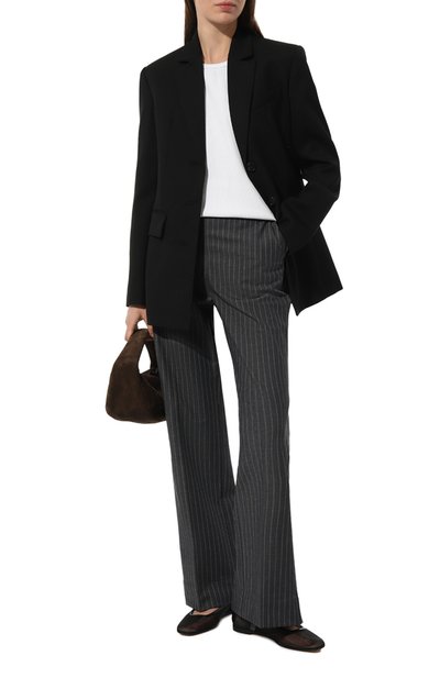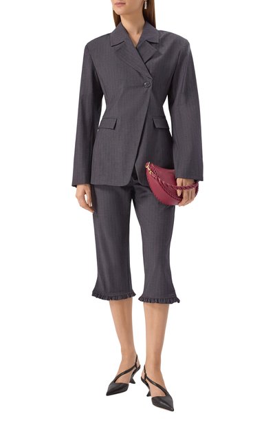 Для пошива брюк в полоску использовали эластичный микс полиэстера и шерсти. Модель со стрелками и четырьмя врезными карманами украсили фирменным патчем сзади, а шнурок на поясе-кулиске дополнили брендированными эглетами.