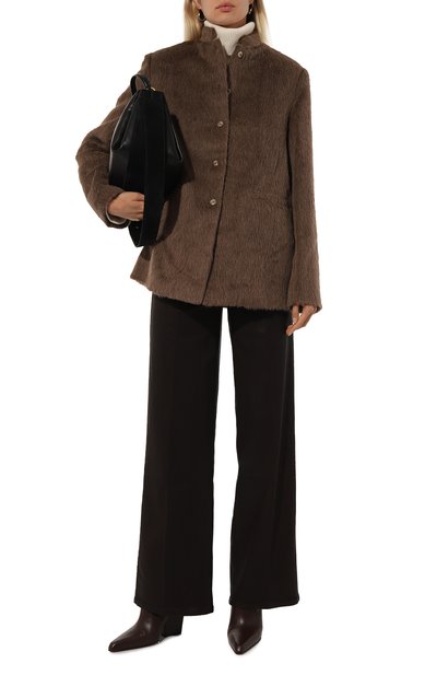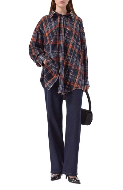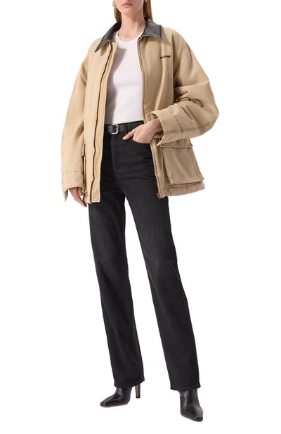 Широкие джинсы с пятью карманами выполнили из неэластичного денима. Модель с выведенными наружу необработанными швами спереди украсили сзади патчем с числовым кодом и фирменной белой строчкой.