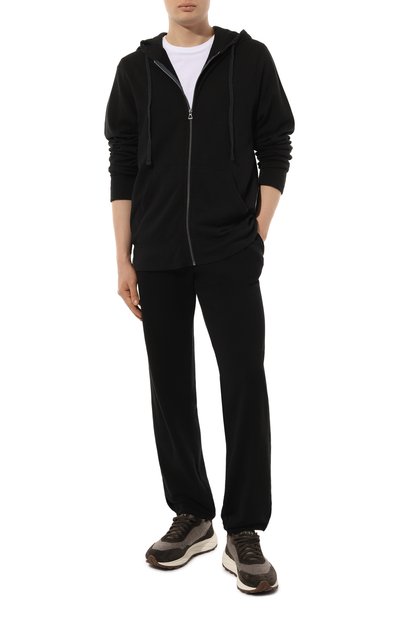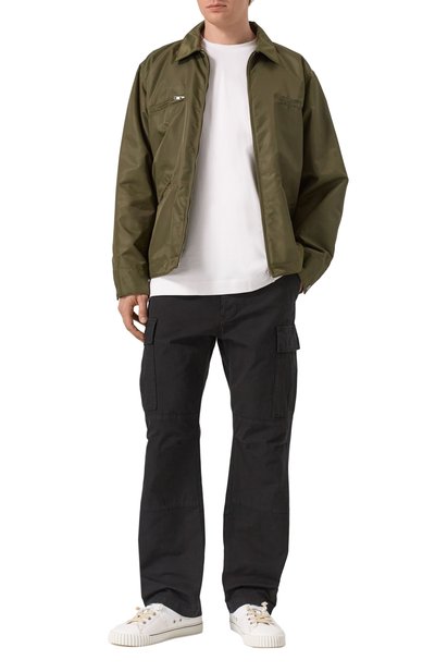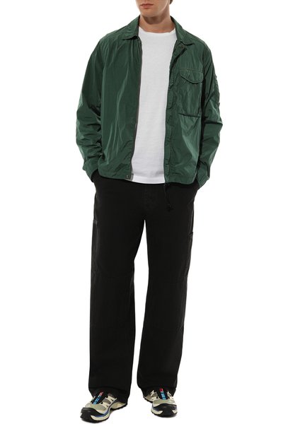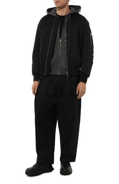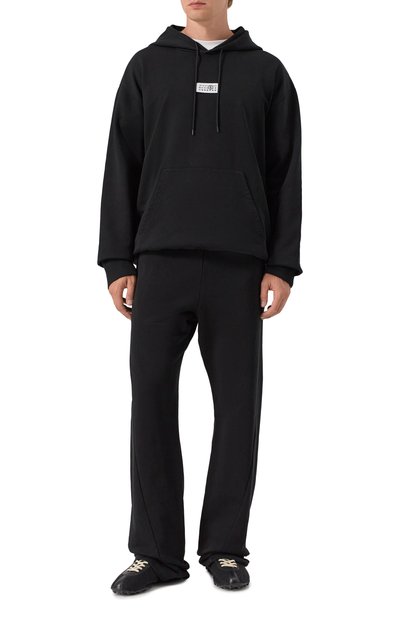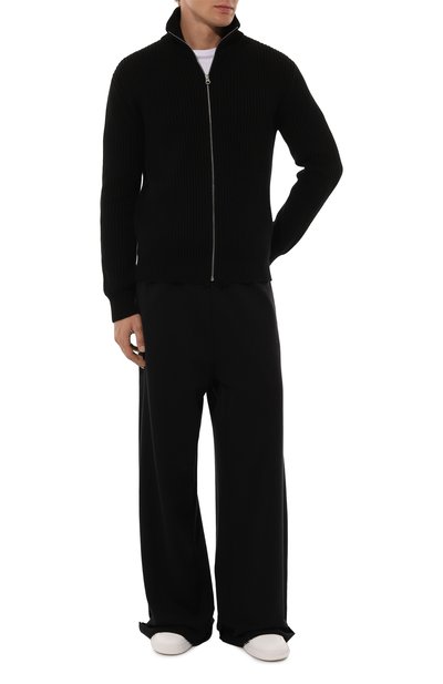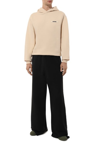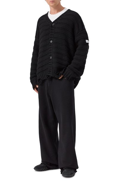 Широкие брюки с эластичным поясом, боковыми и накладным задним карманами выполнили из хлопкового трикотажа. Модель с необработанным низом декорировали вышитым в тон числовым кодом спереди и фирменной белой строчкой сзади.