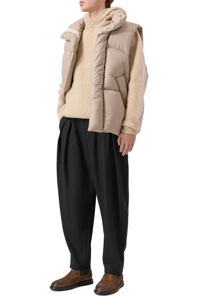 Замшевые челси вручную обработали щетками, чтобы придать состаренн ый вид. Модель с эластичными текстильными вставками по бокам и петлей на заднике поставили на широкую протекторную подошву.