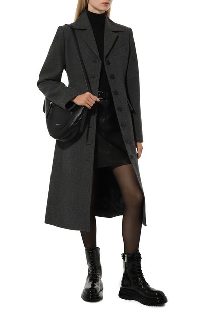 Высокие ботинки выполнили из гладкой кожи. Модель на резиновой протекторной подошве с литым каблуком застегивается боковой молнией с брендированным пуллером.