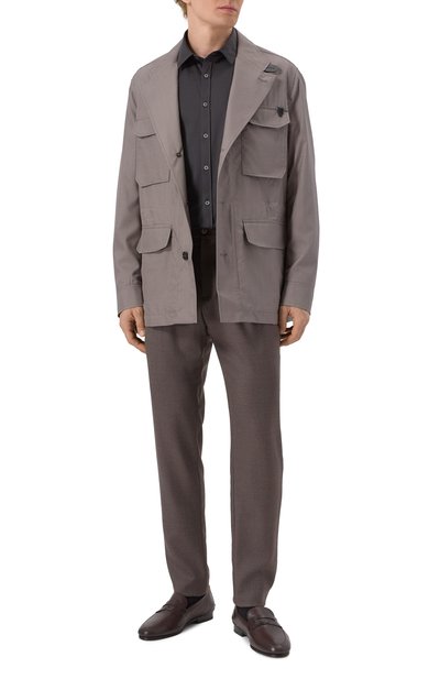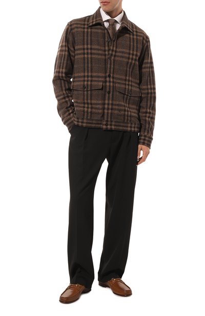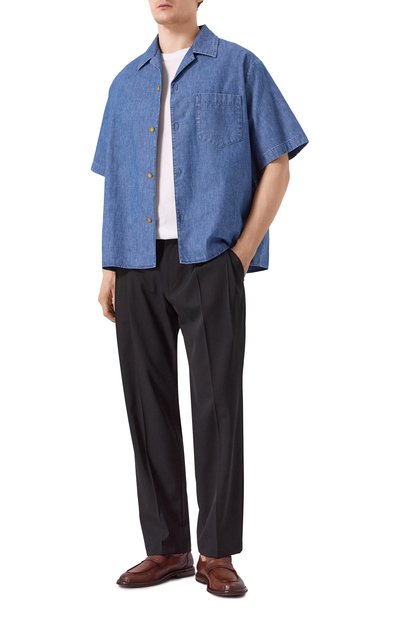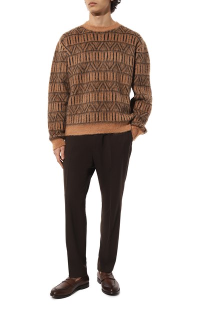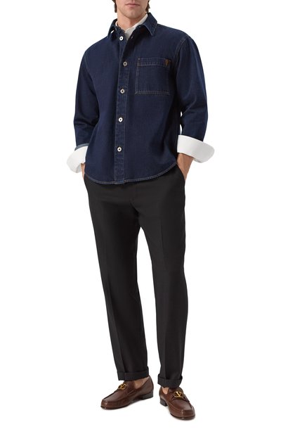 Пенни-лоферы из гладкой полированной кожи дополнили мелкозернистой патинированной вставкой на союзке. Пару с брендированной стелькой поставили на двухслойную подошву в тон.