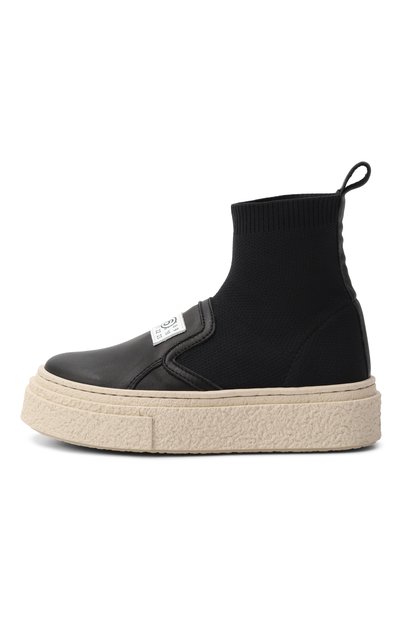 Высокие слипоны изготовили из эластичного текстиля и мелкозернистой кожи. Модель украсили тисненым логотипом на контрастной массивной подошве и нашивкой с числовым кодом на союзке.