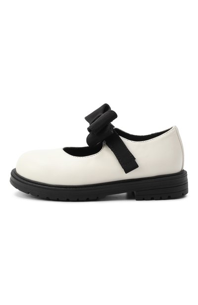Туфли с круглым мысом выполнили из гладкой кожи. Пару на широкой протекторной подошве дополнили ремешком велкро из репсовой ленты, декорированным крупным бантом.