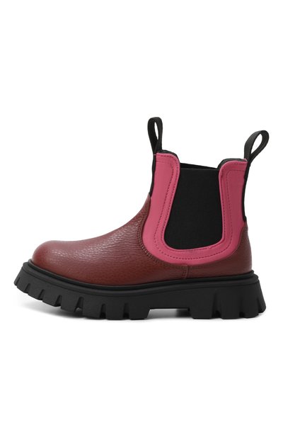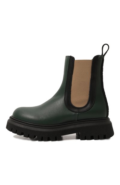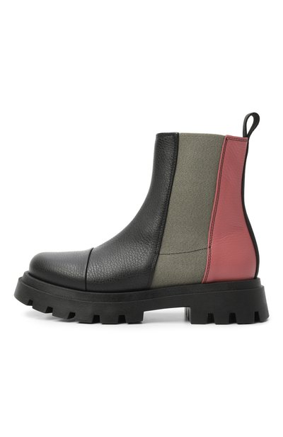 Челси с контрастными и эластичными вставками по бокам сшиты из зернистой кожи. Ботинки с круглым мысом дополнены массивной протекторной подошвой и брендированной лентой с петлей.
