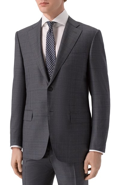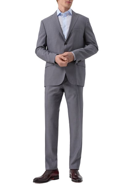 Меланжевый костюм выполнили из шерсти. Пиджак с парой шлиц сзади дополнили нагрудным и двумя боковыми карманами, а у брюк предусмотрели четыре кармана.