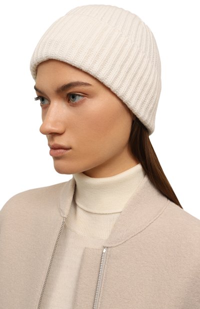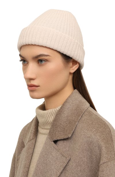 Шапка бини с широким отворотом в рубчик связана из кашемировой пряжи средней плотности. Однотонный аксессуар оставили без декора.