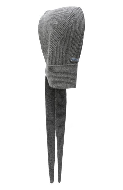 Капор выполнили из кашемирового трикотажа в рубчик. Аксессуар с широкой манжетой и регулируемой кулиской станет удачной альтернативой шапке и шарфу.