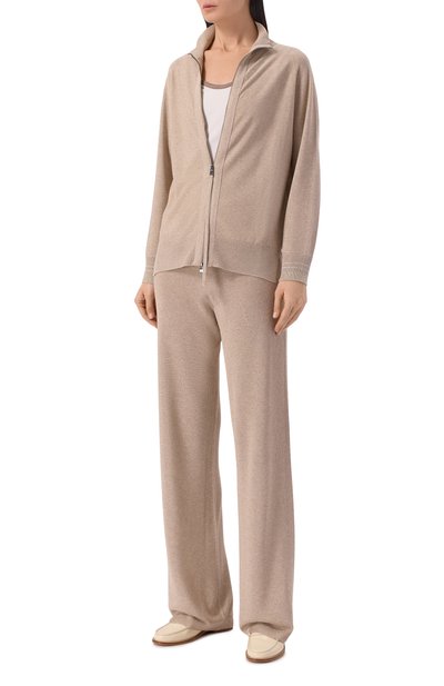 Джоггеры с регулируемой кулиской на поясе выполнили из шерстяного трикотажа с добавлением кашемира. Спереди модель дополнили парой накладных карманов.