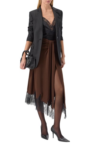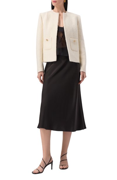 Юбку-трапецию длиной ниже колен выполнили из эластичного шелкового атласа. Модель со средней посадкой органично впишется в базовый гардероб.