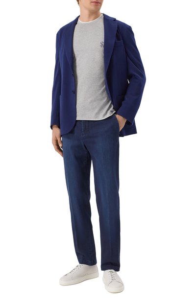 Меланжеву ю футболку из хлопкового джерси украсили геральдической эмблемой, вышитой канителью, кристаллами и жемчужными бусинами. Круглую горловину подчеркнули небольшим контрастным патчем с логотипом марки.