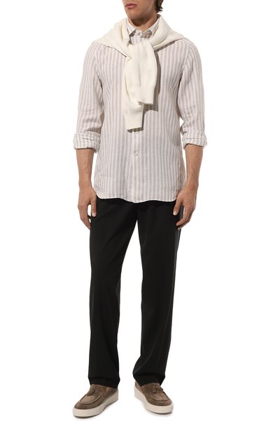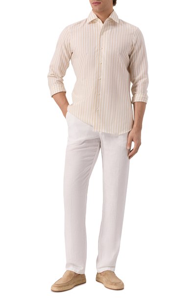 Сорочку из хлопкового поплина в цветную полоску дополнили узкими манжетами и воротником из однотонной ткани. Сзади на левом рукаве вышили монограмму DG, а на спинке сформировали бантовую складку.