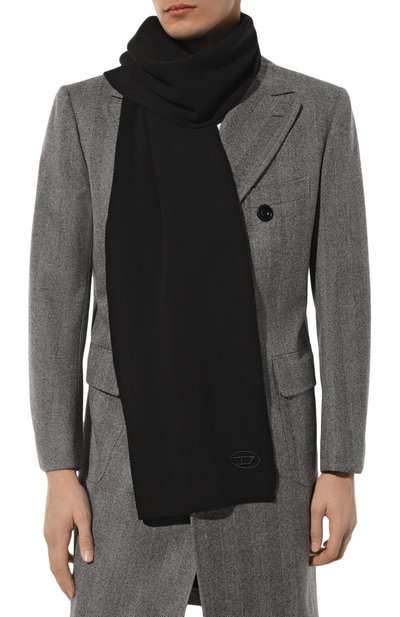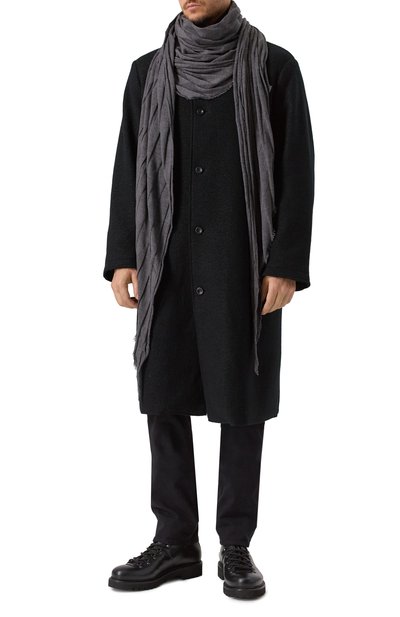 Треугольный трикотажный шарф со стеганым клетчатым узором выполнили из тонкой мериносовой шерсти. Размеров аксессуара с короткой бахромой по краям хватит, чтобы несколько раз обернуть вокруг шеи.