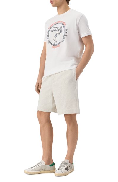 Кеды Super Star на гибкой подошве выполнили из гладкой кожи. Пару с фирменными потертостями ручной работы декорировали логотипами на заднике и язычке, а также замшевой аппликацией-звездой и почтовыми штампами сбоку.