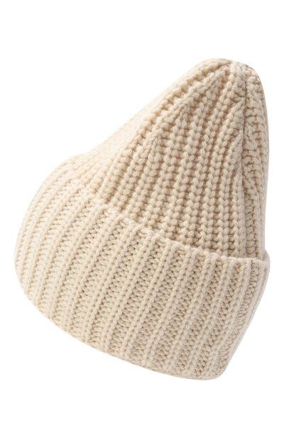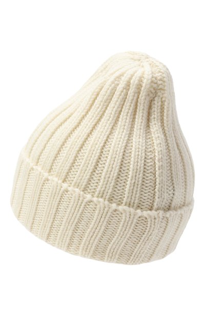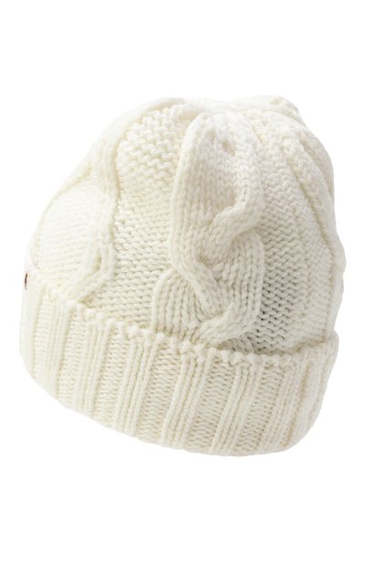 Шапка бини из шерстяной пряжи оттенка papyrus white одинаково хорошо сочетается и с курткой, и с пальто. Аксессуар рельефной вязки украсили фирменной нашивкой на отвороте.