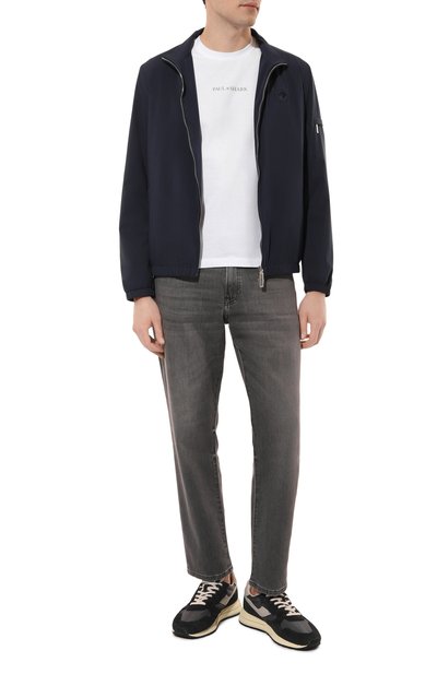 Для изготовления футболки с круглой горловиной использовали хлопковый трикотаж. Модель украсили контрастными логотипом спереди и эмблемой в виде фрагмента пятиконечной звезды сзади.